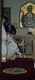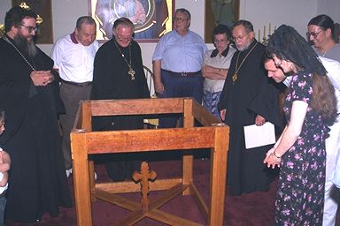 Andrew Fetchina designed the "bread board" construction of the table top. No nails were used anywhere in the construction.Note the small wood pegs for the edge. Natural glue was used where absolutely necessary. An icon of each of the four evangelists mark each corner. |